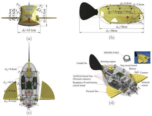 The sensors include an inertial measurement unit (IMU), a camera, an infrared sensor and nine pressure sensors. IMU, camera and infrared sensor are all placed at the central area in the front of the robot. IMU provides the acceleration and attitude information of the robotic fish so that its three-dimensional motions can be monitored. Camera and infrared sensor are used together to capture the surrounding environment. Thus, the robotic fish can avoid obstacles and locate itself. Pressure sensors are distributed over the surface of the shell to establish an ALLS, for measuring the external pressures. Besides, multiple 32-bit micro controllers (STM32F405) on the two circuit boards serve the functions of multisensory data acquisition and locomotion control. Specifically, the top circuit board serves the function of pressure data acquisition. The bottom circuit board is used for controlling steering engines and collecting data of camera, infrared sensor and IMU. In addtion, a credit card-sized micro-computer called Raspberry Pi is adopted as a main processor of the robotic fish. Based on a Linux system (Detain) installed on Raspberry Pi, the robotic fish can be operated autonomously.