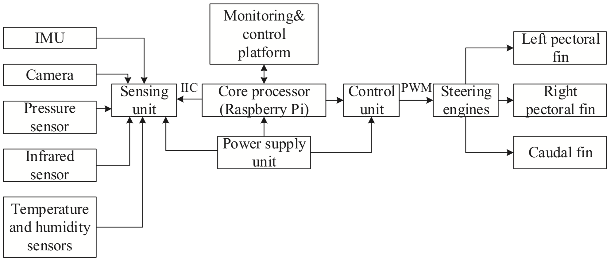 The electrical system which consists of rechargeable batteries, steering engines, circuit boards, and sensors is wrapped in the sealed shell. Figure 2 shows the structure of the electrical system. Sensing unit can acquire a variety of sensor data and then send the data to the processor through IIC transport protocol. The processor does a comprehensive analysis about the surrounding environment and the movement state of the robotic fish according to the sensor data. After processing the sensor data, the processor will send motion commands to control unit. Control unit receives motion commands from the processor and then controls the steering engines connected with the paired pectoral fins and the caudal fin for producing propulsive forces .