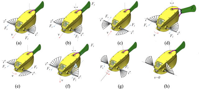 Figure 3 Several typical swimming modes of the robotic fish. (a) Forward swimming [MPF mode]. (b) Forward swimming [BCF+MPF mode]. (c) Backward swimming. (d) Turning on the movement. (e) Turning action with MPF mode. (f) Up-down locomotion. (g) Rolling. (h) Braking