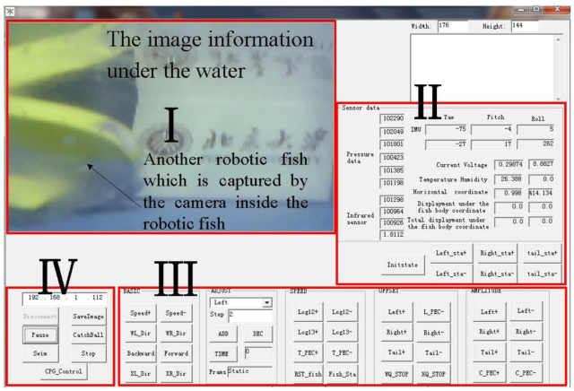 In order to realize observation and control of the robotic fish, we have designed a monitoring and control platform as shown in Figure 4. The platform can be used for parameters displaying, parameters adjustment, and motion control of the robotic fish. It is mainly composed of five major parts which are showed in Figure 4. Area I represents underwater image-displaying area. Area II represents sensor data-displaying area. Area III represents network-setting area. Area IV represents motion-control area.