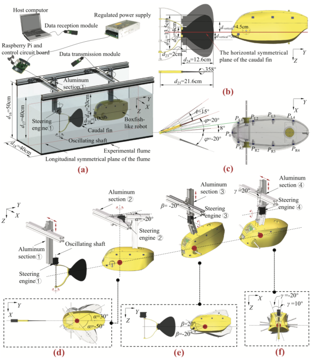 Figure 1 Dimensions and hardware configuration of the robotic fish. (a) Front view. (b) Side view. (c) Top view. (d) Isometric view