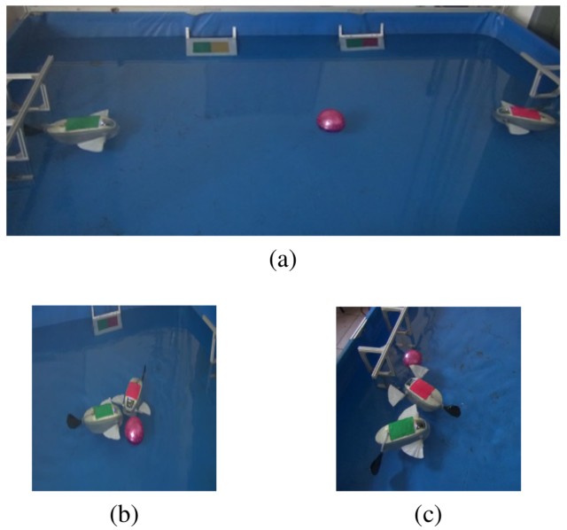 Figure 8 Schematic diagram of the vision-based autonomous robotic fish competition. (a) Beginning of the water polo game. (b) Scrimmaging. (c) Goal