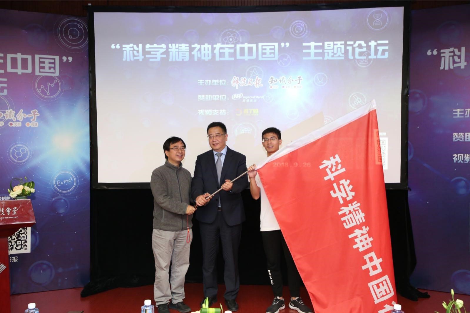The Flag-picking Ceremony.Academician Pan Jianwei (left), editor-in-chief of Science and Technology Daily Liu Yaguang (middle), Zheng Junzheng (right)